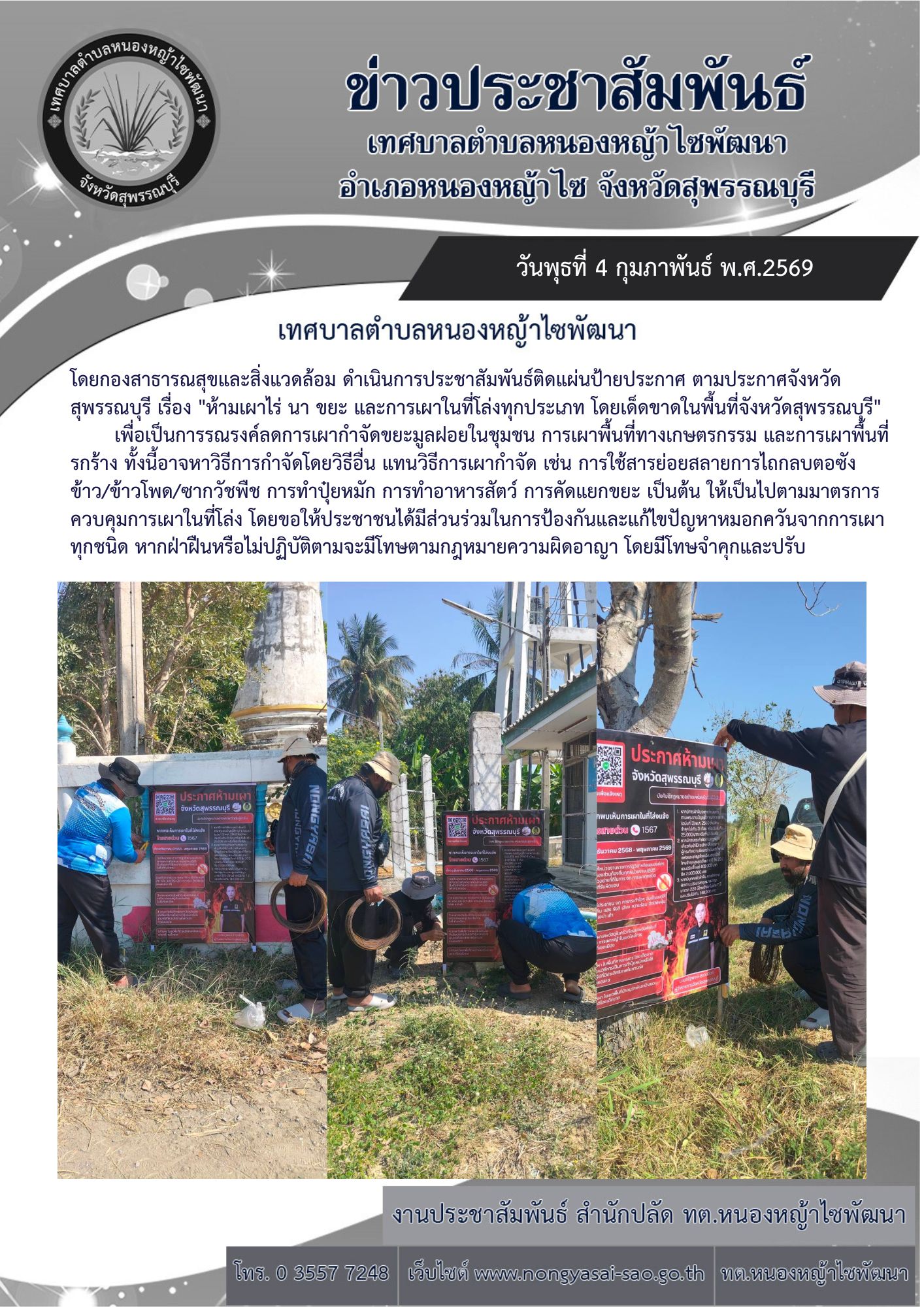 ดำเนินการประชาสัมพันธ์ติดแผ่นป้ายประกาศ ตามประกาศจังหวัดสุพรรณบุรี เรื่อง “ห้ามเผาไร่ นา ขยะ และการเผาในที่โล่งทุกประเภท โดยเด็ดขาดในพื้นที่จังหวัดสุพรรณบุรี”
