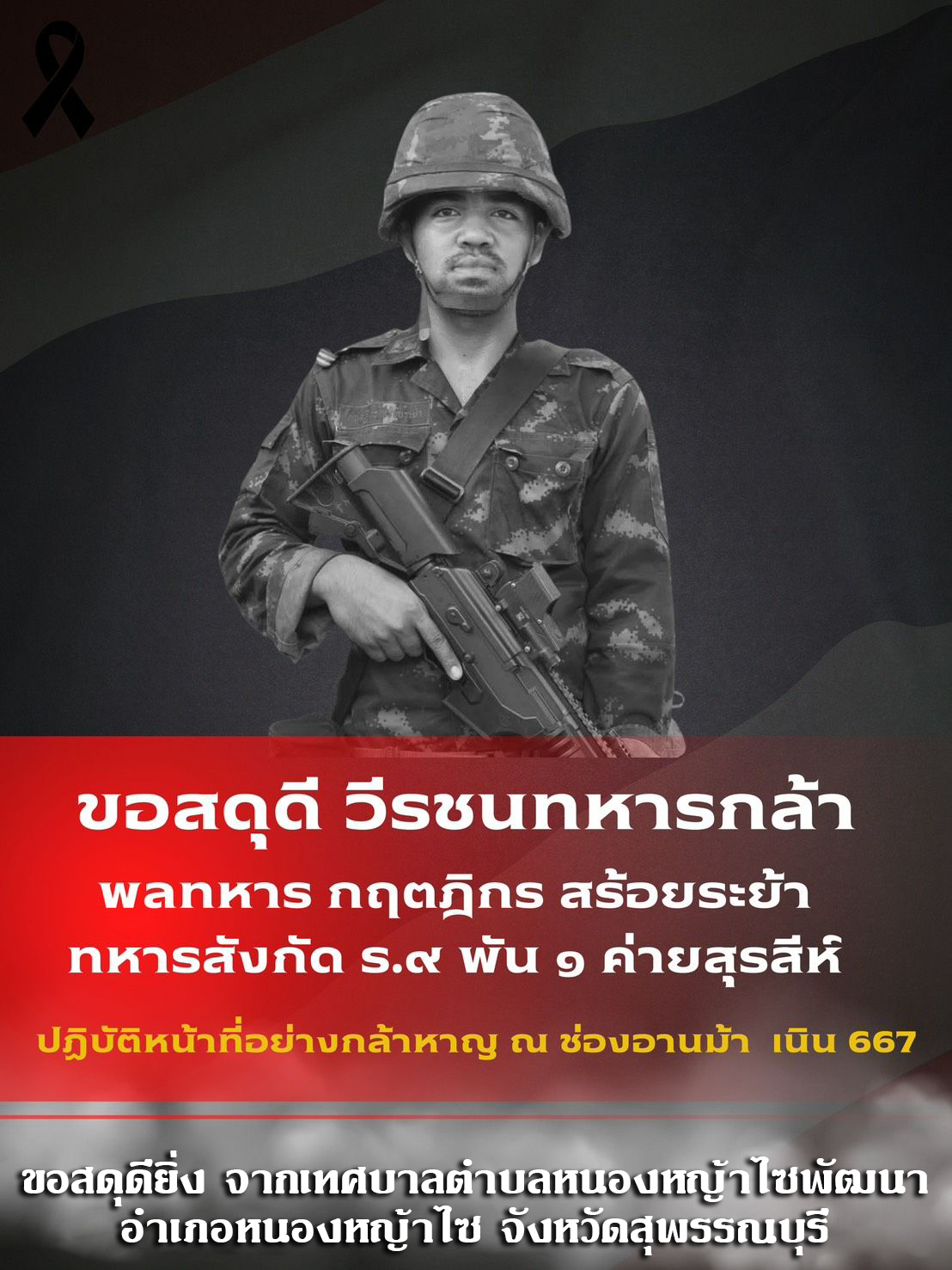 เทศบาลตำบลหนองหญ้าไซพัฒนา ขอไว้อาลัยและสดุดี วีรชนทหารกล้า พลทหารกฤตฎิกร สร้อยระย้า ทหารสังกัด ร.๙ พัน ๑ ค่ายสุรสีห์ ภูมิลำเนาบ้านหนองปลารอด หมู่ที่8 ตำบลหนองหญ้าไซ อำเภอหนองหญ้าไซ จังหวัดสุพรรณบุรี คนตำบลหนองหญ้าไซที่พลีชีพเพื่อชาติ เพื่อปกป้องผืนแผ่นดินไทย จากเหตุการณ์ความไม่สงบชายแดนไทย-กัมพูชา